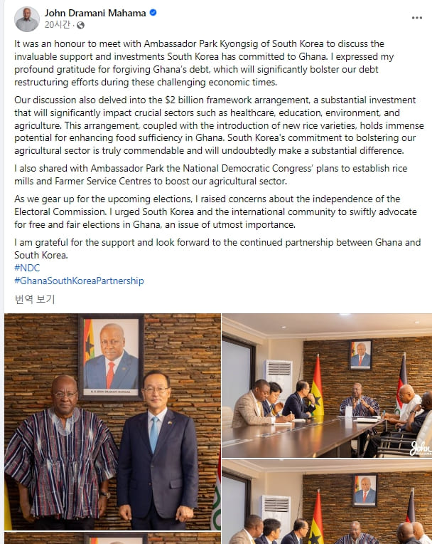 마하마 전 대통령은 "박 대사를 만나 영광이었고, 가나의 부채를 탕감해 준 데 대해 깊은 감사를 표했다"고 밝혔습니다. 이어 "(한국의 가나 부채 탕감은) 어려운 경제 시기에 우리의 부채 구조 조정 노력에 큰 도움이 될 것"이라고 덧붙였습니다.